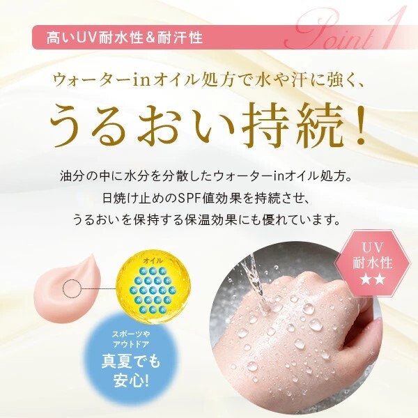 また、ウォーターinオイル処方のため水や汗に強く、日やけ止めのSPF値効果を持続。