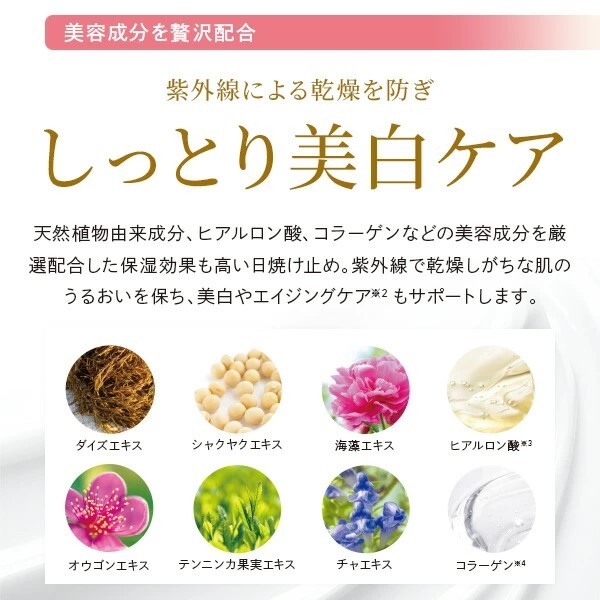 紫外線で乾燥しがちなお肌のうるおいを保持し、美白やエイジングケアもサポートします。