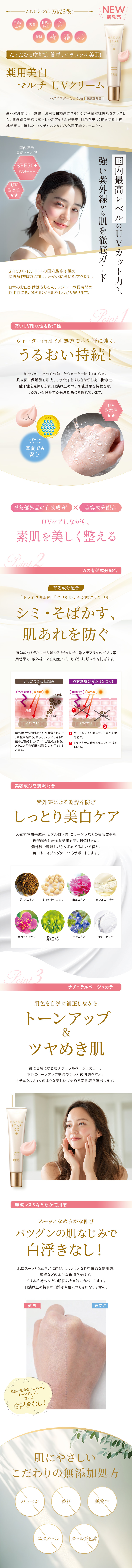 これひとつで日やけ止め、美白、肌荒れ防止、スキンケア、保湿、化粧下地、肌色補正、トーンアップとマルチに働く薬用美白のUV&化粧下地クリームです。国内表示最高レベル(※1)の紫外線カット効果〔SPF50+/PA++++〕に医薬部外品ダブル有効成分「トラネキサム酸」「グリチルレチン酸ステアリル」を配合。紫外線による炎症、シミ・そばかす、肌あれを防ぐ、新アイテム。