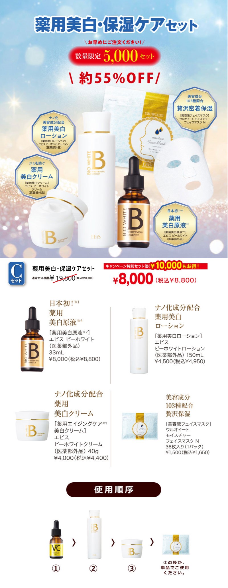 発売以来大人気の日本初※1薬用美白原液※2エビス ビーホワイトを含んだシミやくすみを防ぎ透明感ある肌を目指す4点セットです。セット内容は日本初薬用美白原液※2『エビス ビーホワイト 』、ナノ化成分配合薬用美白ローション『エビス ビーホワイトローション』、シミを防ぐ薬用美白クリーム『エビス ビーホワイトクリーム 』、美容成分103種配合贅沢密着保湿フェイスマスク『ウルオイートモイスチャーフェイスマスクN 』の4点です。限られた数量でのご提供ですので、お早めにお求めください。