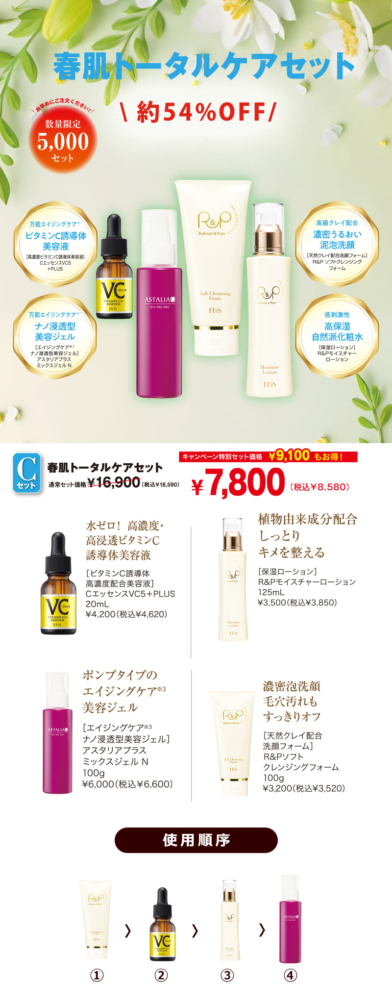 水ゼロ 万能エイジングケア※1美容液『CエッセンスVC5+PLUS』とお肌にやさしい低刺激性高保湿化粧水がセットになった春肌ケアにぴったりの4点セットです。セット内容は天然クレイ「ベラクレイ」と3種類のセラミドによる濃密泡で、しっかり汚れを落とす泡洗顔フォーム『R&Pソフトクレンジングフォーム』、水ゼロ 万能エイジングケア※1美容液『CエッセンスVC5+PLUS』、低刺激性高保湿化粧水『R&Pモイスチャーローション 』、ナノ浸透型オールインワン美容ジェル『アスタリアプラス ミックスジェルN』の4点です。限られた数量でのご提供ですので、お早めにお求めください。