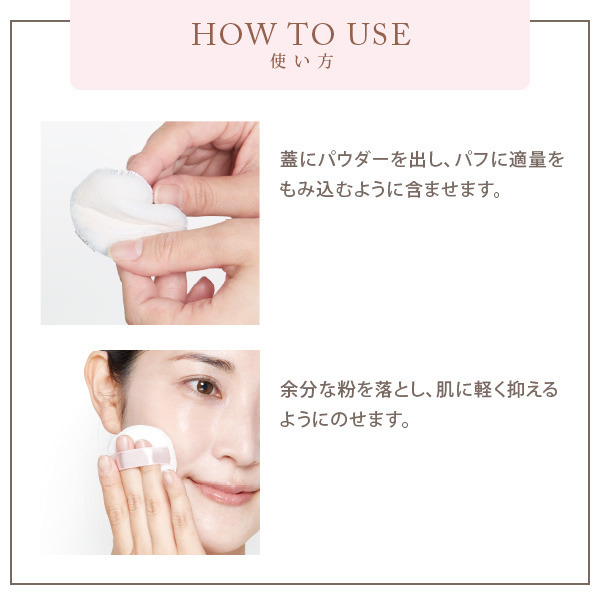 ベースメイクアップの最後の仕上げにお使いください。フタにパウダーを出し、パフに適量をもみ込むように含ませて、余分な粉を落とし、肌に軽く押さえるようにのせます。